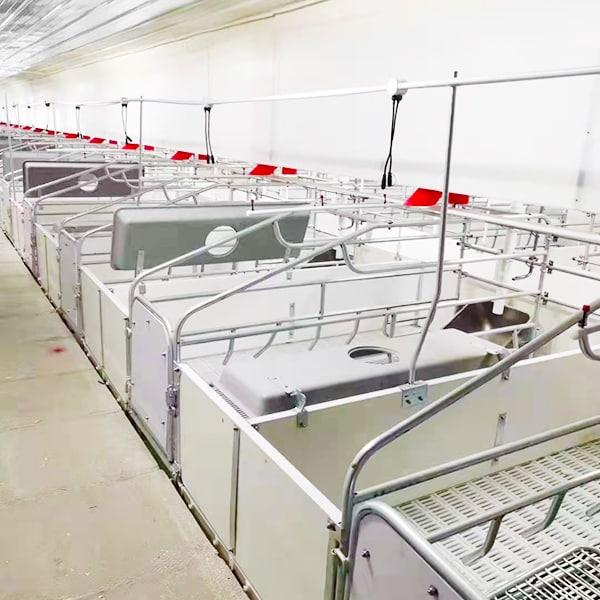 The piglet pen allows piglets to move around and prevent them from running out. There are two types of pig pens, fence, and clapboard. The fence is conducive to ventilation and observation, but not to epidemic prevention. Clapboard type is conducive to epidemic prevention and heat preservation. The length and types of the piglet pens can be customized according to customers’ requirements. A piglet feeding trough and waterer are installed at the rear of the pen, and the floor of the pig farrowing bed can choose a plastic floor or cast iron floor.