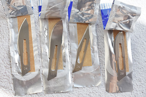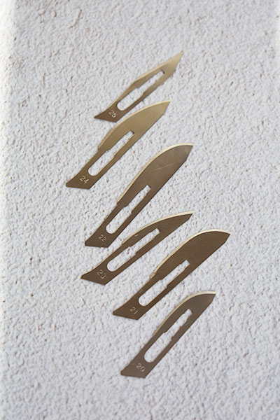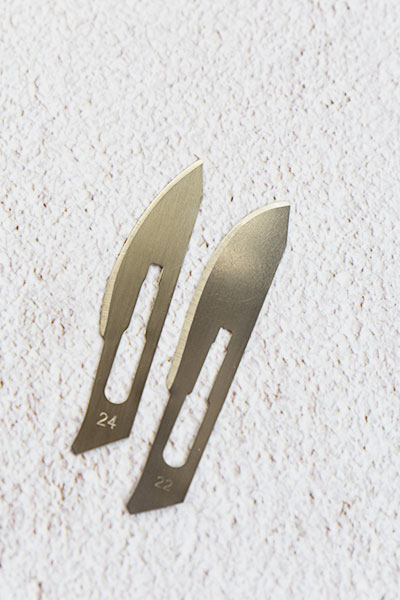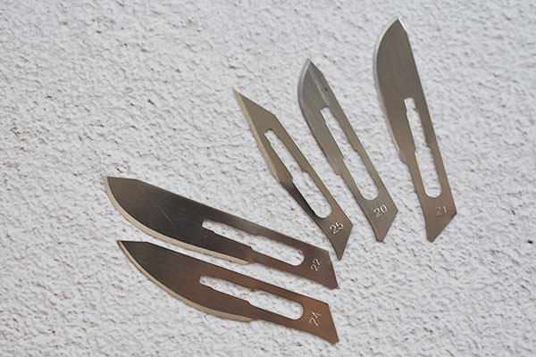 The shape of the blade is designed according to the intended use. Surgical scalpels consist of two parts, a blade and a handle. The handles are often reusable, with the blades being replaceable. In veterinary medical applications, each blade should be used only once.