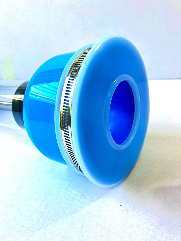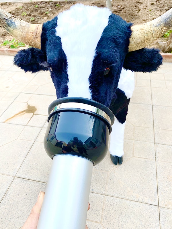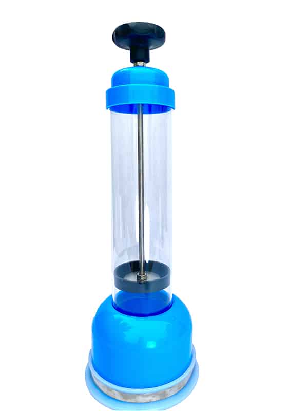 Pull the handle upward until it touches the piston. Place on the calf’s muzzle and press down the handle firmly. Place the lower breathing bowl on the calf’s nose and mouth. Pull the handle upwards to absorb the mucus. Press the handle down to drain the mucus.